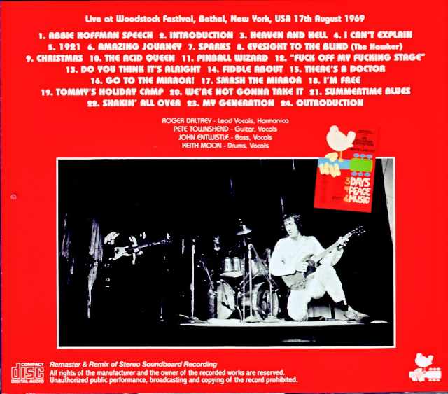 The Who’s 1969 Woodstock Festival performance, a hallmark of their “Tommy,” has been updated with cuts from the previously released “Complete Woodstock 1969”! The sound has also been completely overhauled, resulting in the ultimate Woodstock performance! This is a must-have album! This is not just a reissue, but an astonishing update! Woodstock is The Who’s greatest performance of 1969, following the release of their landmark album “Tommy.” It’s still fresh in our memory that the masterpiece “Complete Woodstock 1969,” capturing the entire experience in perfect sound quality, finally sold out. It’s unacceptable that such a definitive performance, boasting the highest quality multi-track recording, could be cut off from stable supply. It’s become such a huge bestseller. Meanwhile, currently available Woodstock live recordings on other labels suffer from excessive equalization, such as “Smile EQ,” significantly altering and degrading the sound, especially Keith’s drumming. This presents a perfect opportunity to apply the concept of remixing and remastering with cutting-edge AI technology, which has proven extremely effective on various live recordings by The Who, to Woodstock. So, this week, we’re releasing not just a reissue, but a truly reborn Woodstock! Despite long-awaited hopes, The Who have yet to release a complete Woodstock album. When it finally arrived in 2019, it was included in a pricey box set that included the entire event, making it far from readily available. “COMPLETE WOODSTOCK 1969” was released based on the parts included in that box set. While the sound quality was impeccable, perhaps to ensure consistency with the complete set, looking back, it seems like the mix was subdued and demure for a Who live recording. As those who witnessed it unanimously attest, the Who’s live shows at the time were held before a fully-fledged PA system, which made the sound from the stage even more intense. As proof of this, both Pete and Roger suffered hearing loss, but the 2019 mix undeniably toned down the impact of the thunderous live performance. So, once again, using the latest AI technology—which was used to great effect on “LIVE AT LEEDS: 55TH ANNIVERSARY ULTIMATE EDITION” and “DEFINITIVE ISLE OF WIGHT FESTIVAL 1970: LONGEST & RESTORED EDITION”—we’ve remixed and remastered the recording to recreate the overwhelmingly razzle-dazzle feel of a Who live performance in 1969. The inspiration for this remix was the powerful mixes of “Sparks” and “Pinball Wizard” from the soundtrack of the film “THE KID ARE ALRIGHT.” Using the latest AI technology, the recording was first broken down into 10 tracks: six drum parts (crash, ride, hi-hat, kick, snare, toms), guitar, bass, vocals, and cheers. Each track was then remastered and mixed down. First and foremost, you’ll be struck by the thick sound of Pete’s Gibson SG. This alone puts it on another level from the previously released “Complete Woodstock 1969.” Even more impressive is Keith’s drumming, as mentioned at the beginning! His unparalleled power and dynamic drumming have been reborn with a tighter, more vivid sound than ever before! And the highlight is the extended recording, including Abbie Hoffman’s speech before the Who’s appearance, which was cut from “Complete Woodstock 1969,” as well as the announcement after the show. Even the contours of the legendary moment when Pete kicks Hoffman out after he rejoins the stage during the live performance are heard with greater intensity, a testament to the sound production. This not only improves the sound quality, but also dramatically enhances the reproduction of this legendary night as a documentary. Remaster & Remix of Stereo Soundboard Recording Woodstock Festival, Bethel, New York, USA 17th August 1969 UPGRADE!!!! (69:34) 01. Abbie Hoffman Speech★ 02. Introduction 03. Heaven And Hell 04. I Can’t Explain 05. 1921 06. Amazing Journey 07. Sparks 08. Eyesight To The Blind (The Hawker) 09. Christmas 10. The Acid Queen 11. Pinball Wizard 12. “Fuck Off My Fucking Stage”★ 13. Do You Think It’s Alright 14. Fiddle About 15. There’s A Doctor 16. Go To The Mirror! 17. Smash The Mirror 18. I’m Free 19. Tommy’s Holiday Camp 20. We’re Not Gonna Take It 21. Summertime Blues 22. Shakin’ All Over 23. My Generation 24. Outroduction★ STEREO SOUNDBOARD RECORDING