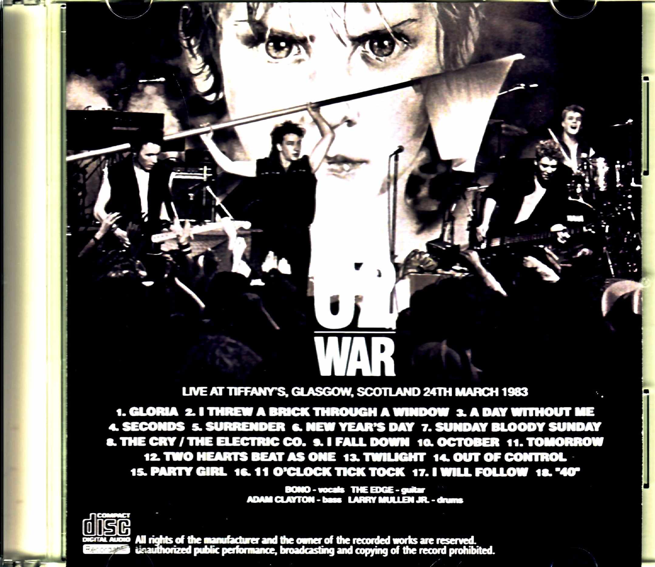 This work is recorded from the “Glasgow Performance on March 24, 1983”. It’s probably the best audience recording. I’m sorry to suddenly become weak, but this work sounds so good. In fact, it is a master provided by the same researcher, and it is definitely an audience recording and a stamp of approval, but it is still hard to believe. In fact, this recording has once been distributed as a complete sound board (although the master at that time was overly equalized and the sound pressure was emphasized to the point of being painful to the ears, but this work is even more natural. It is a master endorsed by researchers). Since there is another CD that is a genuine official-class sound board, it is “after all a customer record”, but if this work was alone, it would be a superb recording that you would want to believe in FM broadcasting. And the direct sound is drawn to a full show that surpasses another CD. Let’s organize how much it has increased by comparing the sets. Irish October (5 songs) Gloria/I Threw A Brick Through A Window/I Fall Down/October/Tomorrow WAR (6 songs) Seconds (★)/Surrender/New Year’s Day/Sunday Bloody Sunday/Two Hearts Beat As One/”40″ (★) Others (7 songs + α) Boy: A Day Without Me/The Cry-The Electric Co./Twilight (★)/Out of Control/I Will Follow (★) Single: Party Girl/11 O’clock Tick Tock (★) *Note: “★” marks songs that cannot be heard on the other CD. …And so on. That’s five more songs. Moreover, those songs are scattered throughout the show. In other words, the FM broadcast that was the basis for the other CD was not a part of the show, but rather a best-of broadcast of selected songs on a song-by-song basis. And the emphasis in the broadcast was on “OCTOBER”, and conversely, there were many cuts from the new albums “WAR” and “BOY”. I don’t understand why they cut new songs in the promotion of the new album, and the deadly “I Will Follow” was also cut. It’s nice that there are many rare songs, but considering the situation at the time of the broadcast, it is clear that the intention was not readable. The best part of the full show is that it’s more than just reading the back of the broadcast. Even though they made a breakthrough, they still haven’t acquired the feeling of being a big star, and their live performance is like a young warrior live band itself. You can fully experience such a “WAR Tour” with the best sound comparable to a sound board. This is a separate CD that is a high-quality update of the precious sound board, and a full live album like a line recording. Tiffany’s, Glasgow, Scotland 24th March 1983 TRULY PERFECT SOUND (79:59) 01. Gloria 02. I Threw A Brick Through A Window 03. A Day Without Me 04. Seconds★ 05. Surrender 06. New Year’s Day 07. Sunday Bloody Sunday 08. The Cry – The Electric Co. 09. I Fall Down 10. October 11. Tomorrow 12. Two Hearts Beat As One 13. Twilight★ 14. Out Of Control 15. Party Girl 16. 11 O’clock Tick Tock★ 17. I Will Follow★ 18. “40”★