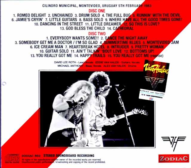 The latest installment in engineer Roy’s new soundboard series, which imprints live performances never before heard onto your brain, is set to be released! This new release features the Uruguay performance from their South American tour. The permanently preserved recording is from the Montevideo performance on February 5, 1983, in superb stereo soundboard quality. The “NO PROBLEM Tour” was the only South American tour in Van Halen’s history. It was a full-scale tour that visited four countries and included 14 performances, but the Uruguay performance was only one show. While a recording from a local FM station has been known for some time, this release is from a completely different source. It is a newly discovered master with significantly improved sound quality. For those who have been following the series and are looking to organize their collections, let’s start with an overview of their activities, as usual. 1982 “HIDE YOUR SHEEP Tour” – July 14th – August 21st: North America #1 (26 shows) ← *8 works – September 1st – 25th: North America #2 (17 shows) ← *4 works – October 7th – December 11th: North America #3 (38 shows) ← *3 works 1983 “NO PROBLEM Tour” – Date unknown “REHEARSALS 1983 SOUNDBOARD” – January 14th – February 12th: South America (15 shows) ← ★HERE★ – May 21st “US FESTIVAL REHEARSAL 1983 SOUNDBOARD” – May 29th: US festival appearance This is an overview of their activities during the “DIVER DOWN” era. The usual “HIDE YOUR SHEEP Tour” accompanying the album ended in 1982, and in 1983, the band embarked on their only ever South American invasion, the “NO PROBLEM Tour”. Let’s take a closer look at the schedule and confirm the position of this work. Details of “South America (“NO PROBLEM Tour”)” – January 14: Caracas (first day) * January 15: “CARACAS 1983 SOUNDBOARD” * January 16: “CARACAS 1983 SOUNDBOARD (partial)” * January 21: “SAO PAULO 1983 1ST NIGHT SOUNDBOARD” – January 22: São Paulo (second day) – January 23: São Paulo (third day) – January 26: Rio de Janeiro (first day) * January 27: “RIO DE JANEIRO 1983 2ND NIGHT SOUNDBOARD”? January 29: Belo Horizonte performance? * February 1: “PORTO ALEGRE 1983 1ST NIGHT SOUNDBOARD”? February 2: Porto Alegre (second day)? * February 5th: Uruguay performance ←★This release★ February 11th + 12th: Argentina (2 performances) Leaked soundboard that renders the standard FM recordings obsolete…and so on. Along with this new discovery, the tour dates have also been updated, and the above is the latest theory at the moment. This Montevideo performance is the 12th performance of the South American tour. Compared to 3 performances in Venezuela, 8 in Brazil, and 2 in Argentina, Uruguay was only for one night. It was truly a “once-in-a-lifetime” stage. As mentioned above, the standard recording of this Montevideo performance is the FM recording. If you’ve taken the time to read this article, you’ve probably heard it at least once in some previously released version. However, this release is completely different from that standard FM broadcast. It’s not even a broadcast, but a recording made directly from the mixing console by a man named “Roy,” who was the band’s engineer. Moreover, it’s not just that the source is different, but the sound has also been significantly upgraded. Traditional FM recordings (typical of South America?) were full of overdubbing marks, resulting in numerous problems such as dropouts, stereo imbalances, and unstable tape speeds. However, this new master is on a completely different level. As the original master, there are no overdubbing marks whatsoever, and the directness, freshness, and vibrancy are incomparable. The sound is the familiar direct-to-board style from the series, with the live performance flowing into your brain unprocessed. If I had to pick one thing, Michael Anthony’s bass is particularly thick this time around. It’s so powerful that every single note has a heavy bass that shakes your insides and kicks you in the gut. This is the full set from the end of the South American tour, including the premiere of “Dancing In The Street.” The sheer power of the sound alone is enough to fill you up, but the sheer volume of content in this release is also incredible. With a running time of approximately 114 minutes, this is the second longest recording in the series, following the previous release, “PORTO ALEGRE 1983 1ST NIGHT SOUNDBOARD (Zodiac 845),” which was approximately 117 minutes long. It was also recorded using two 90-minute tapes, resulting in minimal loss due to tape changes. It’s almost the full length, allowing listeners to enjoy tracks that weren’t available on FM broadcast. Let’s take a look at the contents of this recording. The Fuse of Fire (6 songs) – Runnin’ With the Devil / Jamie’s Cryin’ / Little Dreamer / Ice Cream Man / Ain’t Talkin’ Bout Love / You Really Got Me (Happy Trails) (*) Diver Down (7 songs) – The Full Bug / Little Guitars / Where Have All the Good Times Gone! / Dancing In The Street (*) / Cathedral / Intruder / (Oh) Pretty Woman Others (10 songs + α) – The Legendary Bomber: Dance the Night Away / Somebody Get Me a Doctor / Bottoms Up! (*) – Others: Romeo Delight / Unchained / So This Is Love? (*) / God Bless The Child / Everybody Wants Some!! / Summertime Blues (*) / Heartbreak Hotel *Note: The “*” mark indicates the previous album ‘PORTO ALEGRE 1983 1ST NIGHT’ This is a tour debut of songs that weren’t heard on the ‘SOUNDBOARD’. The “*” mark indicates songs that were cut from the FM broadcast version. …and so on. The encore songs “Bottoms Up!”, “You Really Got Me”, and “Happy Trails”, which weren’t on the FM broadcast, make their first appearance. In the main set, three songs stand out: “Dancing In The Street”, “So This Is Love?”, and “Summertime Blues”. All