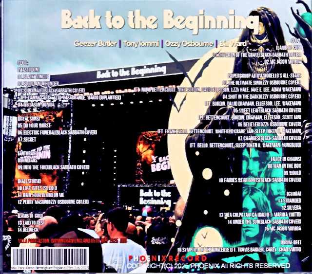This CD features a live recording of Black Sabbath and Ozzy Osbourne’s final performance at Villa Park in Aston, Birmingham, England, on July 5, 2025, as well as a charity concert featuring a stellar lineup of artists. The sound quality is excellent, thanks to the SBD source. Back to the Beginning 2025 Villa Park:Aston, Birmingham England 05th July 2025 CD01:[Stage One] [Mastodon] 01.Black Tongue 02.Blood and Thunder 03.Supernaut(Black Sabbath cover) (ft. Danny Carey, Eloy Casagrande, Mario Duplantier) 04.MC:Jason Momoa [Rival Sons] 05.Do Your Worst 06.Electric Funeral(Black Sabbath cover) 07.Secret [Anthrax] 08.Indians 09.Into the Void(Black Sabbath cover) [Halestorm] 10.Love Bites (So Do I) 11.Rain Your Blood On Me 12.Perry Mason(Ozzy Osbourne cover) [Lamb of God] 13.Laid to Rest 14.Redneck CD02:[Stage One] [Lamb of God] 01.Children of the Grave(Black Sabbath cover) 02.MC:Jason Momoa [Supergroup A]Tom Morello’s All-Stars 03.The Ultimate Sin(Ozzy Osbourne cover) (ft. Nuno Bettencourt, Mike Bordin, David Ellefson, Lzzy Hale, Jake E. Lee, Adam Wakeman) 04.Shot in the Dark(Ozzy Osbourne cover) (ft. Bordin, David Draiman, Ellefson, Lee, Wakeman) 05.Sweet Leaf(Black Sabbath cover) (ft. Bettencourt, Bordin, Draiman, Ellefson, Scott Ian) 06.Believer(Ozzy Osbourne cover) (ft. Frank Bello, Bettencourt, Whitfield Crane, Ian, Sleep Token II, Wakeman) 07.Changes(Black Sabbath cover) (ft. Bello, Bettencourt, Sleep Token II, Wakeman, Yungblud) [Alice in Chains] 08.Man in the Box 09.Would 10.Fairies Wear Boots(Black Sabbath cover) [Gojira] 11.Stranded 12.Silvera 13.Mea Culpa (Ah! Ça ira!) (ft. Marina Viotti) 14.Under the Sun(Black Sabbath cover) 15.MC: Jason Momoa [Drum-off] 16.Symptom of the Universe (ft. Travis Barker, Carey, Chad Smith)