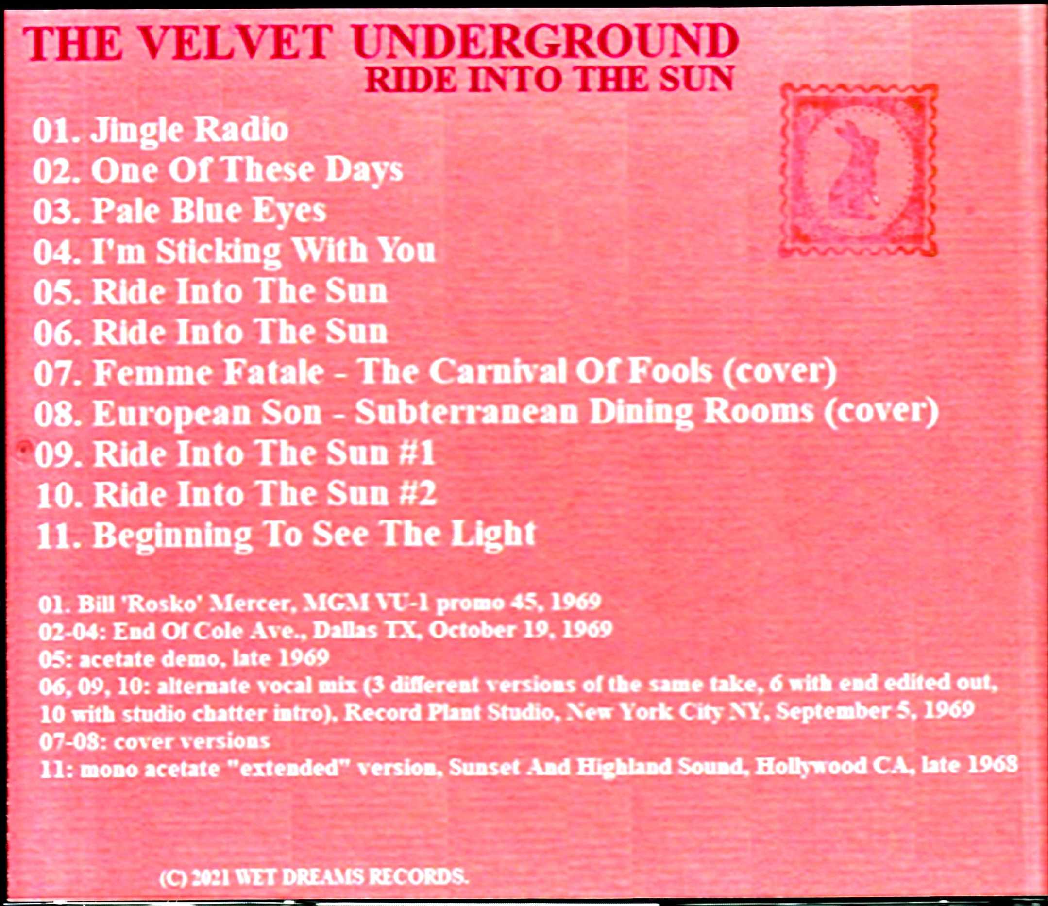 Here is a compilation of the best rare takes, including VU’s 1968-1969 promo tracks, demo tracks, alternate takes, and MONO acetate. Although there are tracks that have been included in each item, we have selected the most valuable sound sources from among them in the best quality. Be sure to check out the parts that feature “RIDE INTO THE SUN” in each sound source. 01. Jingle Radio [Bill ‘Rosko’ Mercer, MGM VU-1 promo 45, 1969] 02. One Of These Days / 03. Pale Blue Eyes / 04. I’m Sticking With You [at End Of Cole Ave., Dallas TX, October 19th 1969] 05. Ride Into The Sun [Acetate Demo, Late 1969] 06. Ride Into The Sun [alternate vocal mix end edited out] 07. Femme Fatale – The Carnival Of Fools [cover] 08. European Son – Subterranean Dining Rooms [cover] 09. Ride Into The Sun #1 [alternate vocal mix : Record Plant Studio, NYC NY, September 5th 1969] 10. Ride Into The Sun #2 [alternate vocal mix with studio chatter intro : Record Plant Studio , NYC NY, September 5th 1969] 11. Beginning To See The Light [Mono Acetate “extended” version, Sunset And Highland Sound, Hollywood CA, Late 1968]