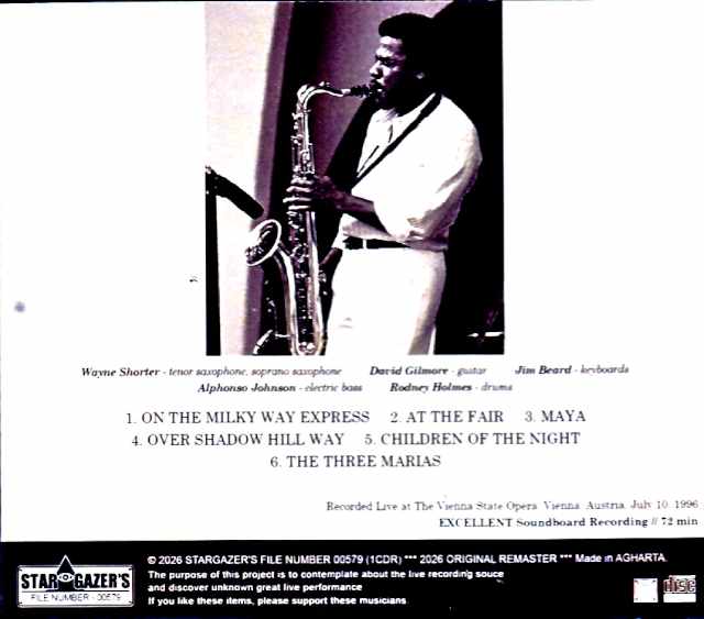 This 72-minute recording captures Wayne Shorter’s quartet’s July 10, 1996 performance in Vienna, Austria, using a soundboard recording from an FM broadcast master. Shorter was a masterful musical director in Miles Davis’s band and a leading figure in the 70s and 80s jazz/fusion scene with Weather Report, his co-led band with Joe Zawinul. The electric band’s ensemble is robust, especially with the masterful keyboard work of Jim Baird and bass by his Weather Report bandmate Alphonso Johnson, showcasing the exceptional approach characteristic of this period and making it a must-have for longtime fans. Recorded at The Vienna State Opera, Vienna, Austria, July 10th 1996 : Soundboard Recording 1. ON THE MILKY WAY EXPRESS 2. AT THE FAIR 3. MAYA 4. OVER SHADOW HILL WAY 5. CHILDREN OF THE NIGHT 6. THE THREE MARIAS Wayne Shorter – tenor & soprano saxophone / David Gilmore – guitar / Jim Beard – keyboards / Alphonso Johnson – electric bass / Rodney Holmes – drums